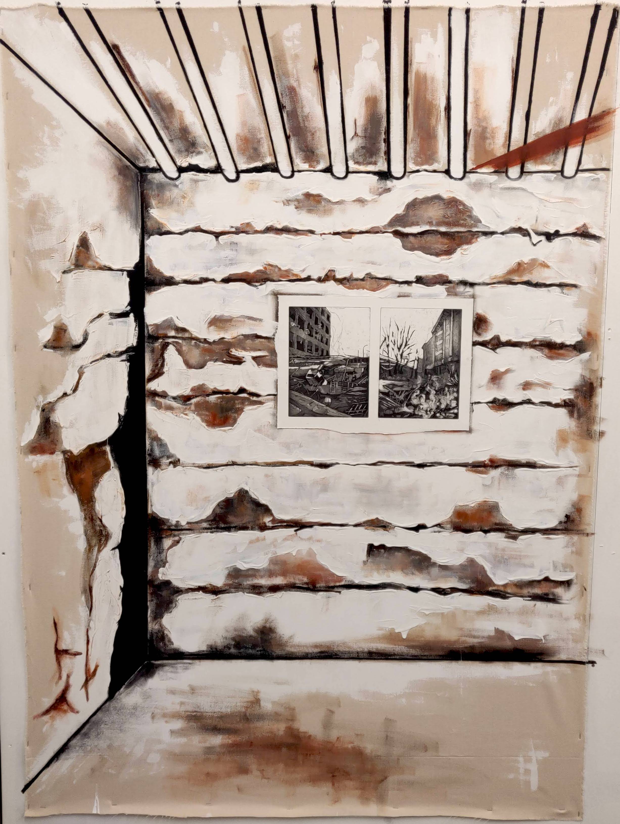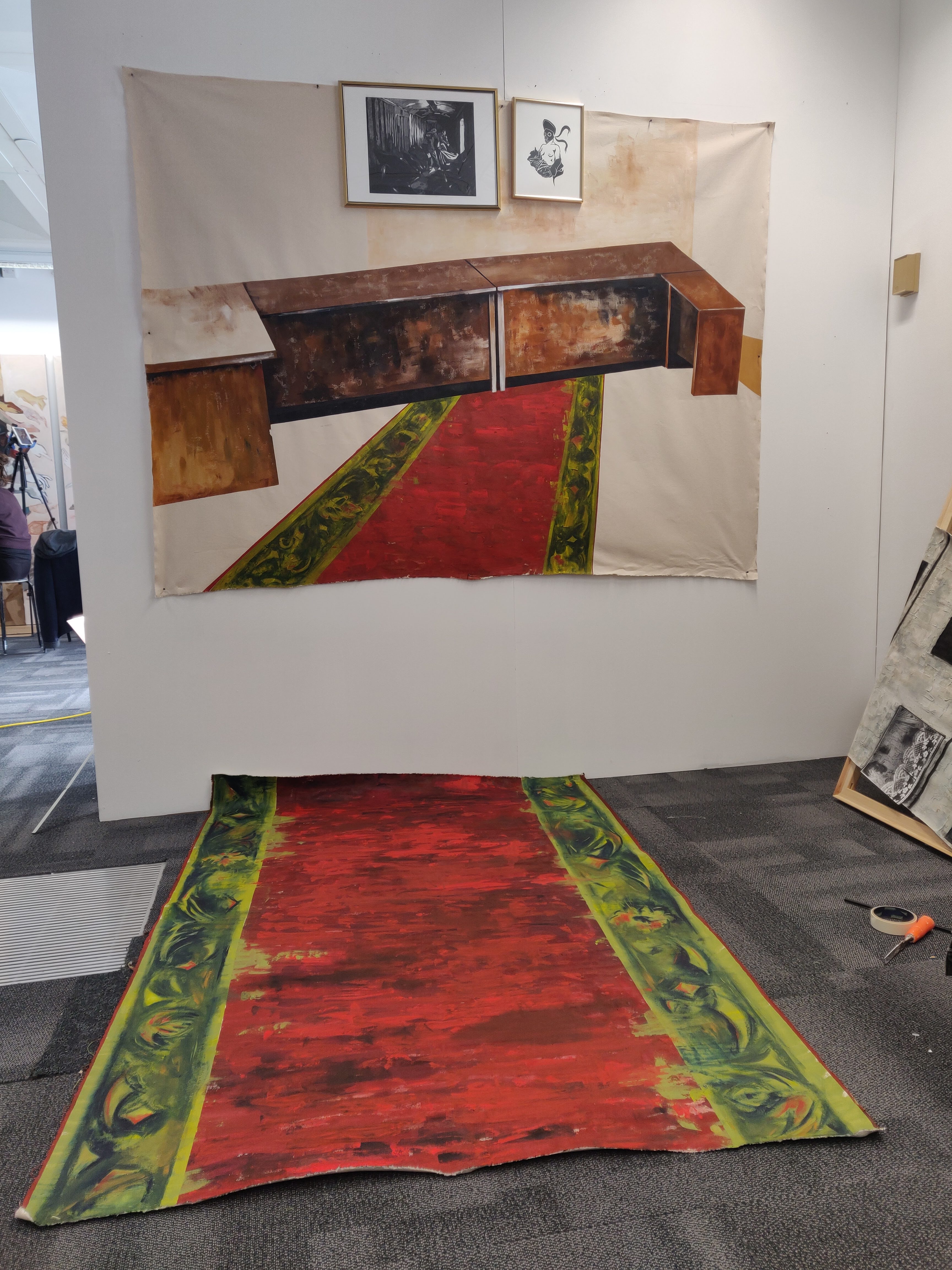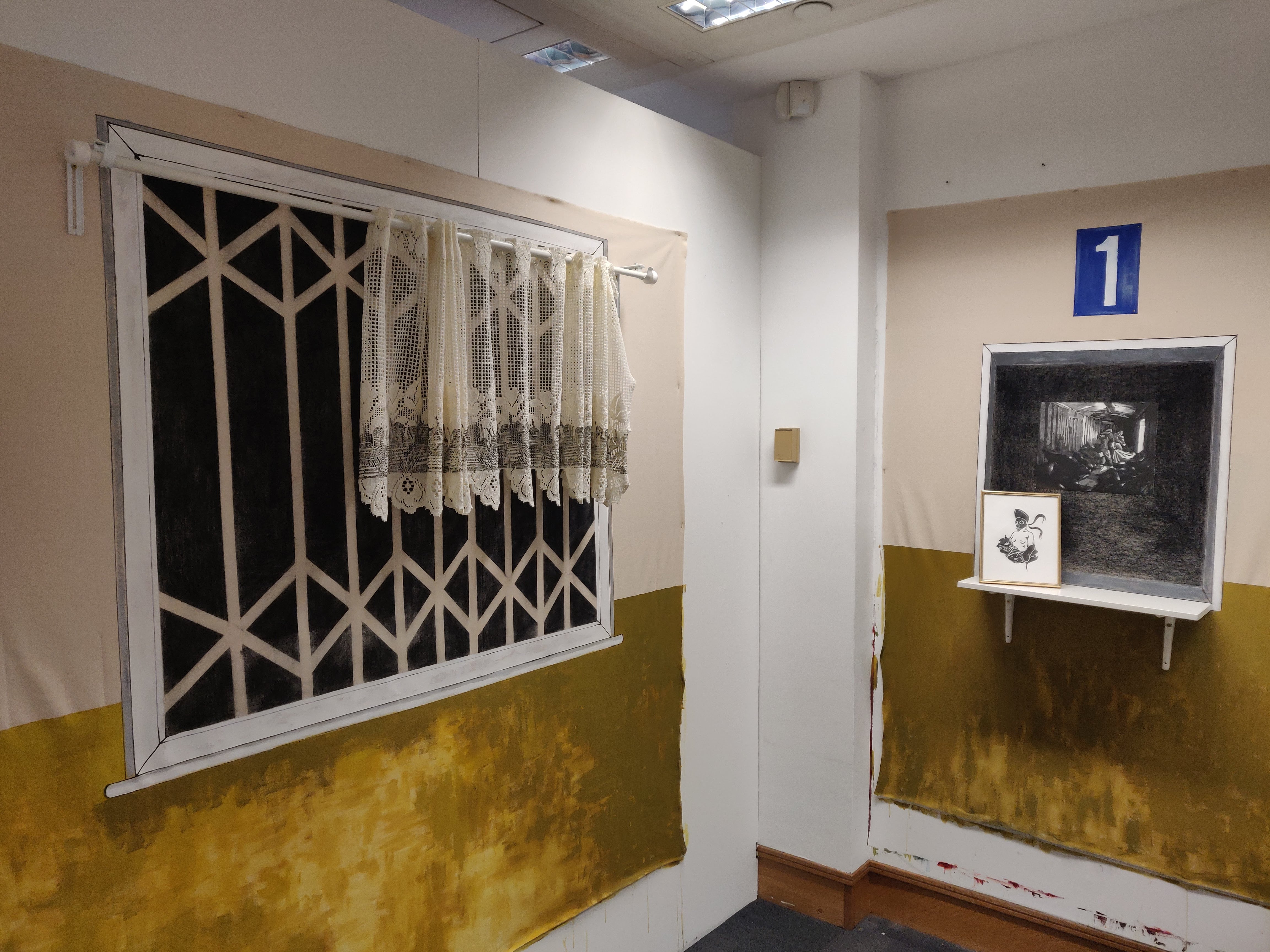 Through my mixed media installation, I like to create spaces for the audience to step into and interact with. The spaces mix elements of the private and public, resulting in an uncanny experience that creates a starting point for discussions and reflections. My installations take on elements of my other work, including printmaking and mixed media paintings, as well as interactive performances.