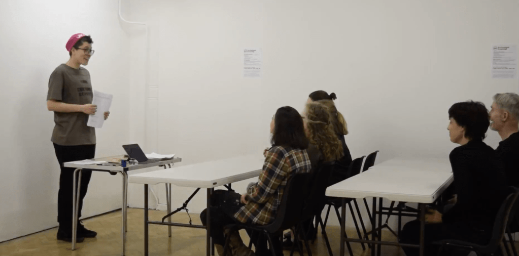 This interactive performance was set up like a fake lecture, during which participants had to fill in feedback forms and be evaluated based on them. “Pre-packaged knowledge” critiques the commodification of higher education, focusing specifically on how we evaluate and thus value education in Western culture.