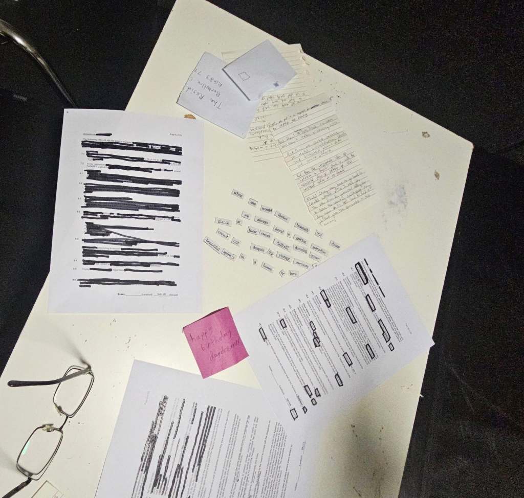 I write and run various interactive performances, the aims of which is to get participants to engage with political and communal themes. Most of my performances involve some form of art-making, such as collaging, drawing, and zine-making.